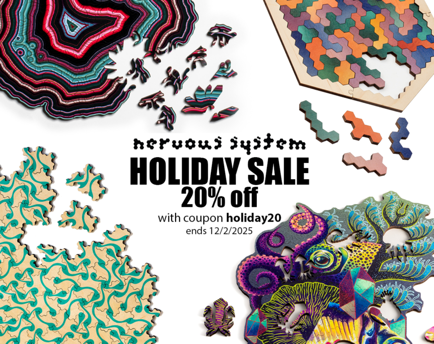 It’s time for our annual sale! Take 20% off most items with the code HOLIDAY20 (ends on Tuesday 12/2/2025). The coupon code must be entered and applied in the shopping cart. The sale includes all our puzzles including custom puzzles and most jewelry. However, certain items are excluded from the sale including engagement rings, wedding bands, and Radiolaria sculptures.
