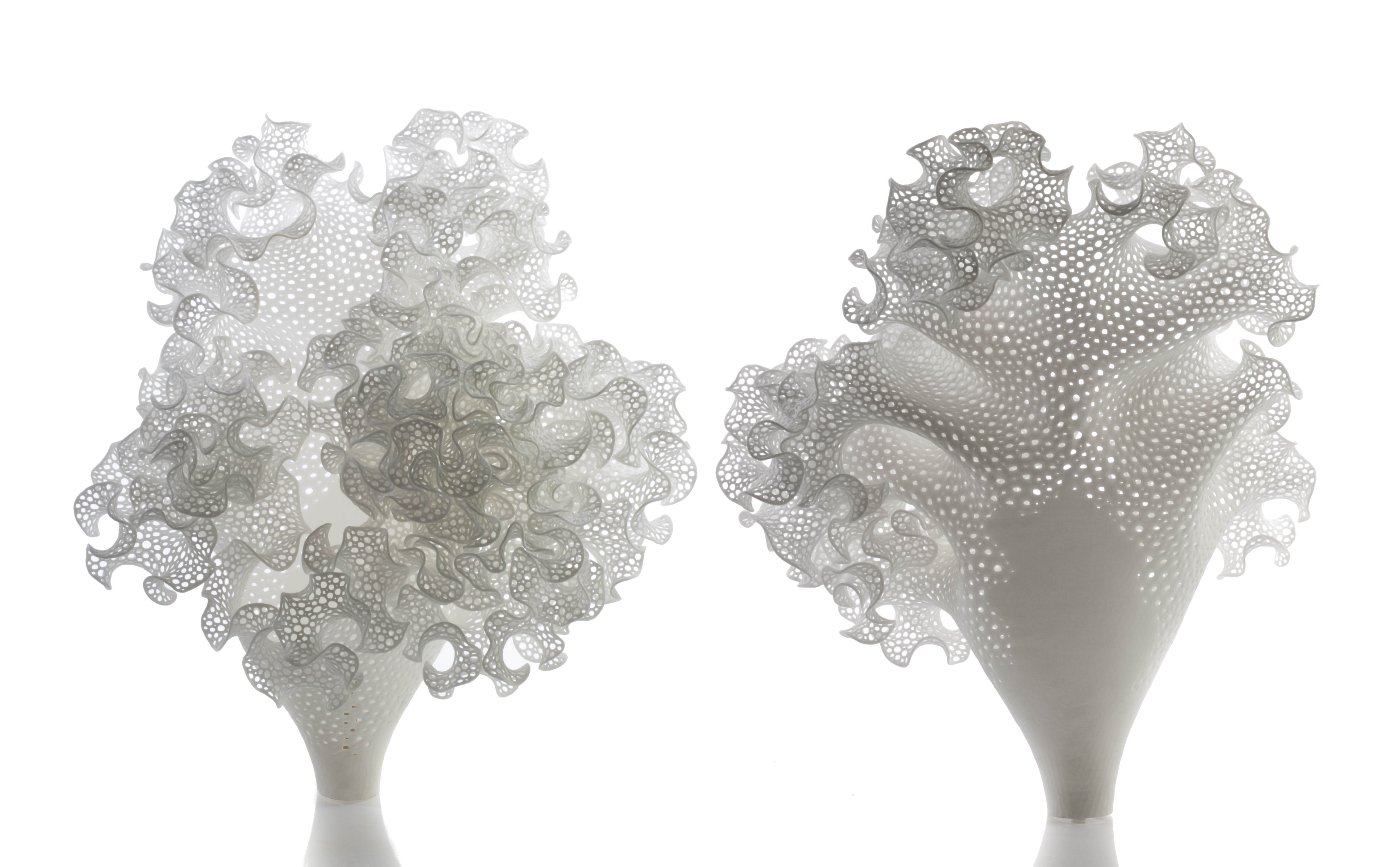 This flower-like form resulted from the growth of a cone grown differentially towards its edge in a noise field. As the surface expands, the growth front moves with it causing complex ruffled forms to emerge. The ruffles become smaller as smaller as the bend strength decreases.