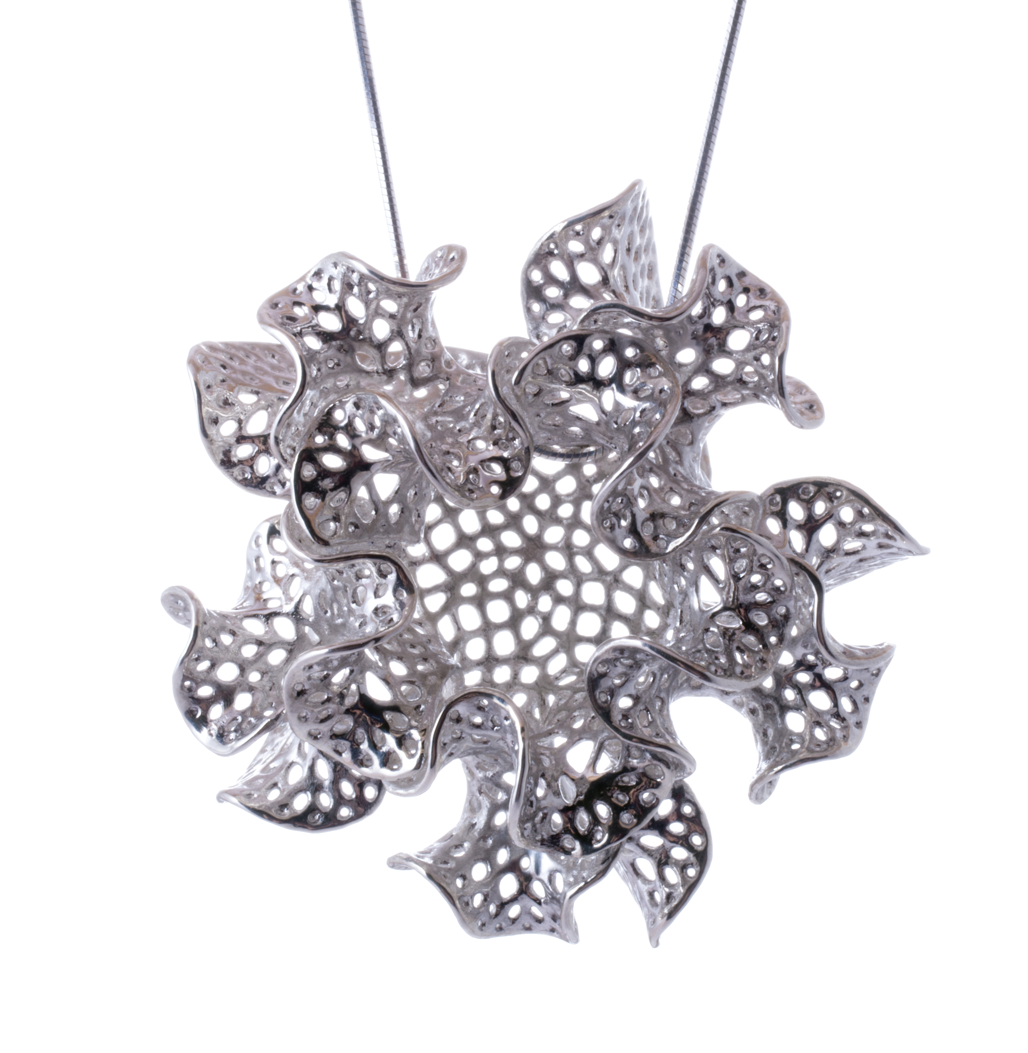 This silver necklace features a pattern of cellular perforations that were inspired by lacy bryozoans. These perforations mirror the growth process by forming a lattice that propagates from the edge of the growing zone.