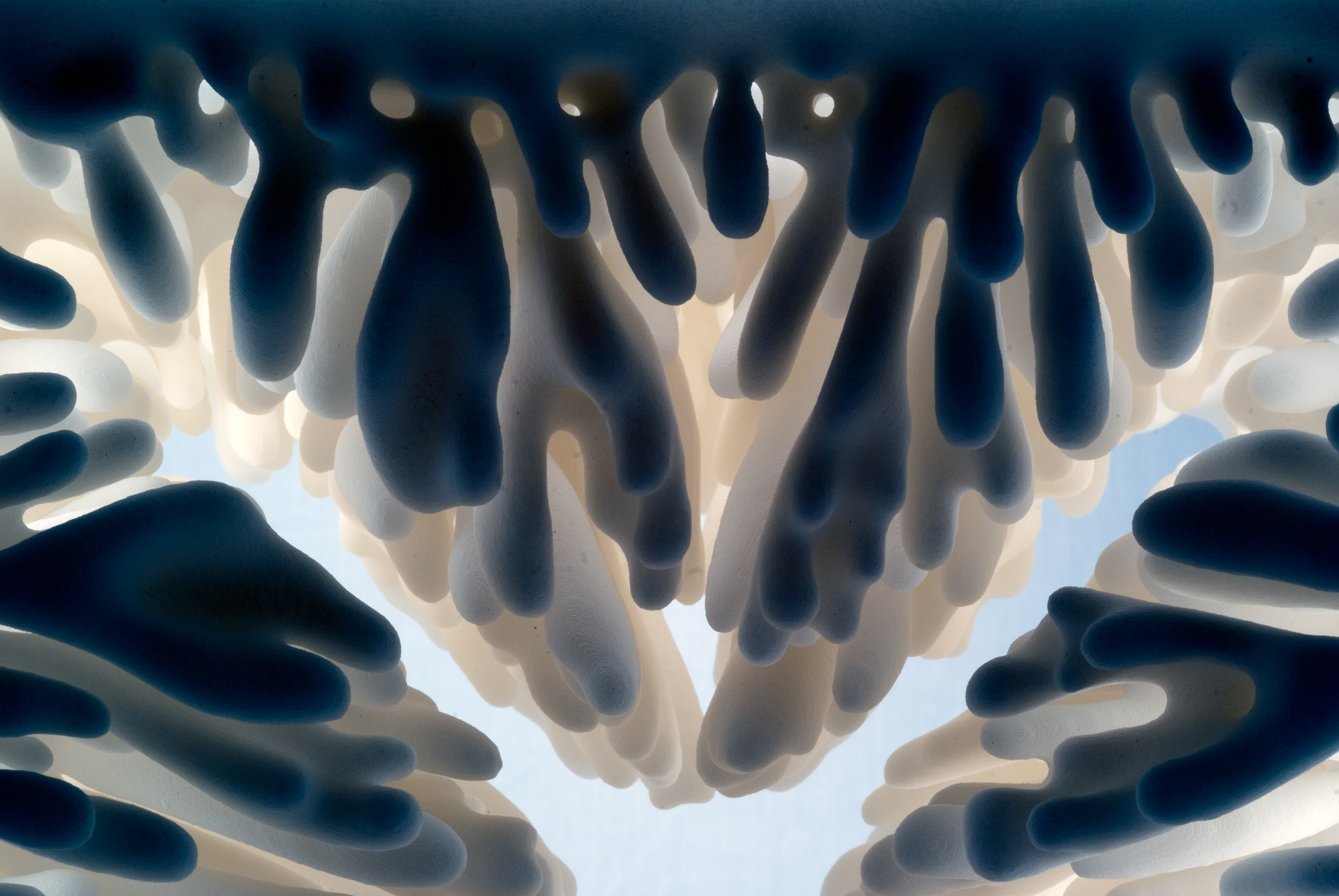 nylon 3D printed by Selective Laser Sintering A seemingly plain cube comes to life on the inside with each surface displaying an incredible garden of organic branching forms. This sculpture explores the concept of Laplacian growth and was created using a numerical model of 3D isotropic dendritic solidification.